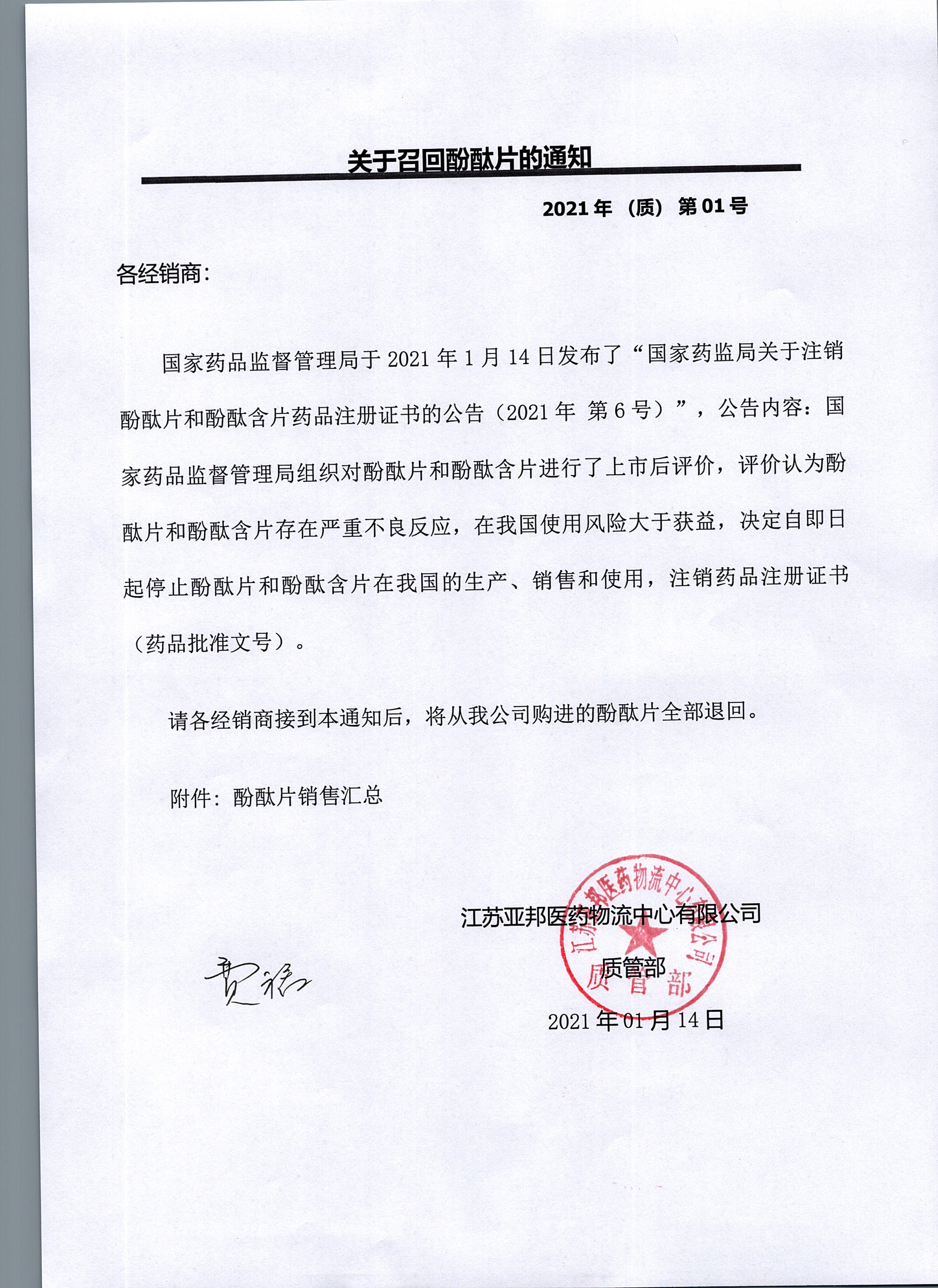 关于召回酚酞片的通知