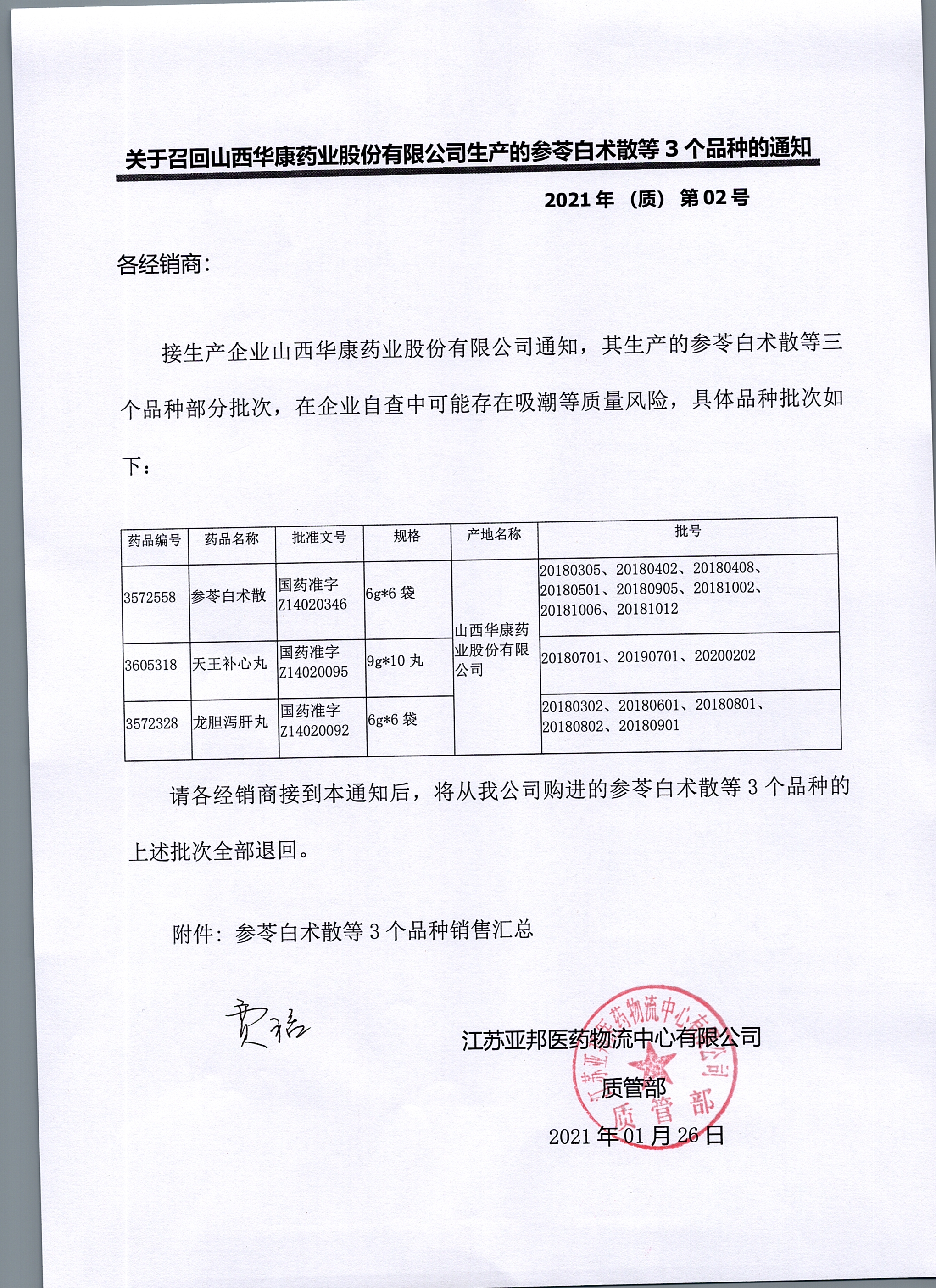 关于召回山西华康药业股份有限公司生产的参苓白术散等3个品种的通知