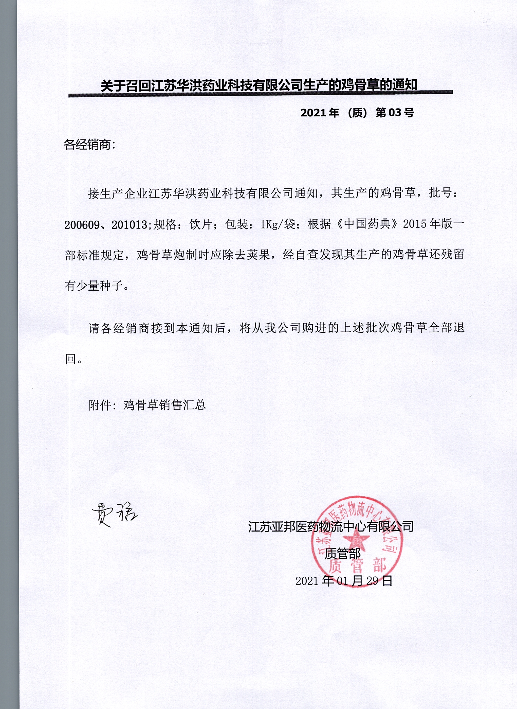 关于召回江苏华洪药业科技有限公司生产的鸡骨草的通知