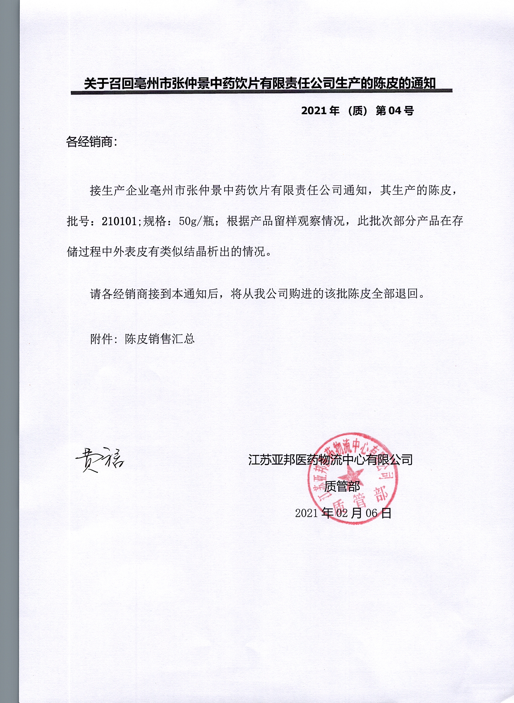 关于召回亳州市张仲景中药饮片有限公司生产的陈皮的通知