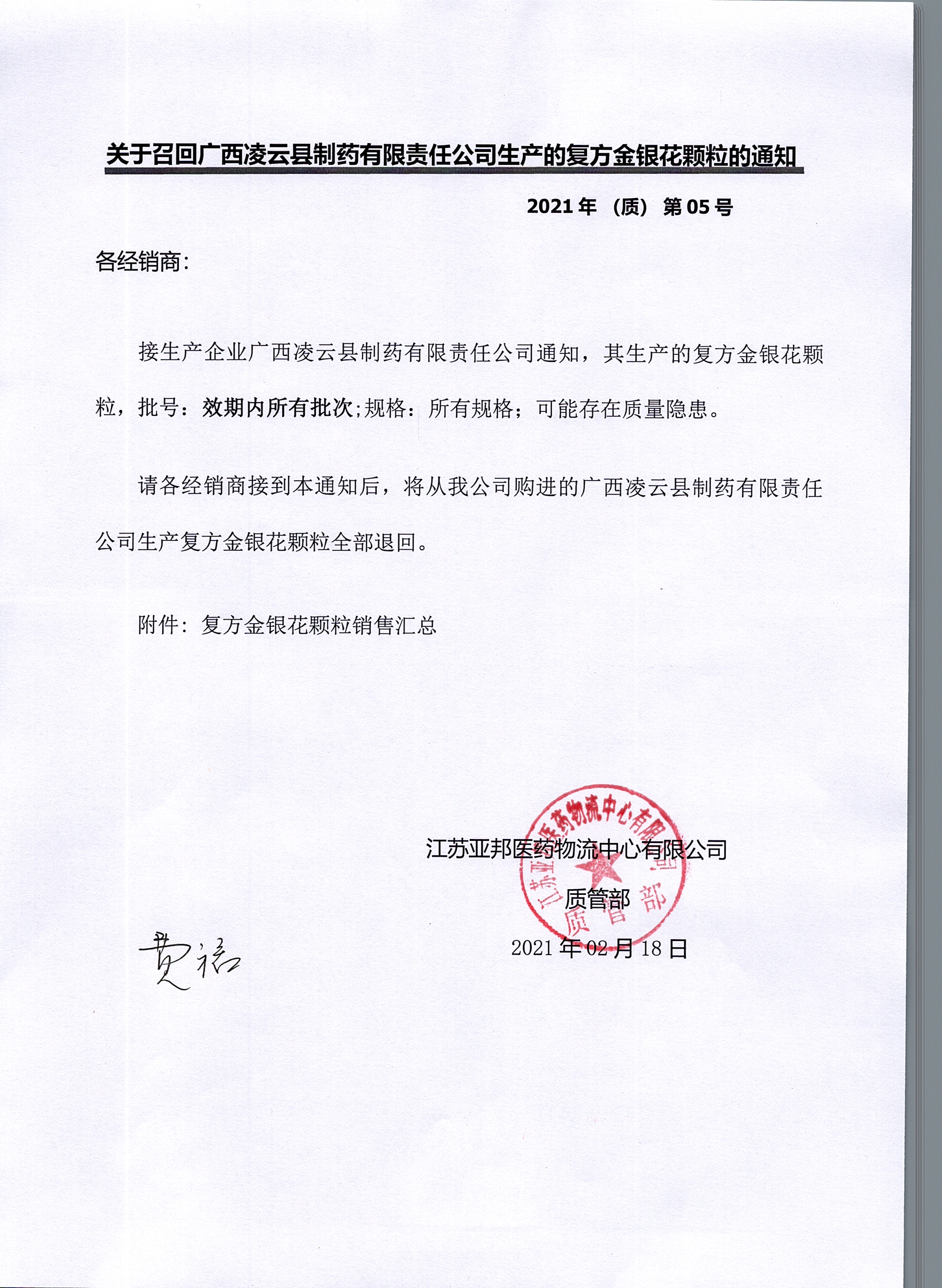 关于召回广西凌云制药有限责任公司生产的复方金银花颗粒的通知