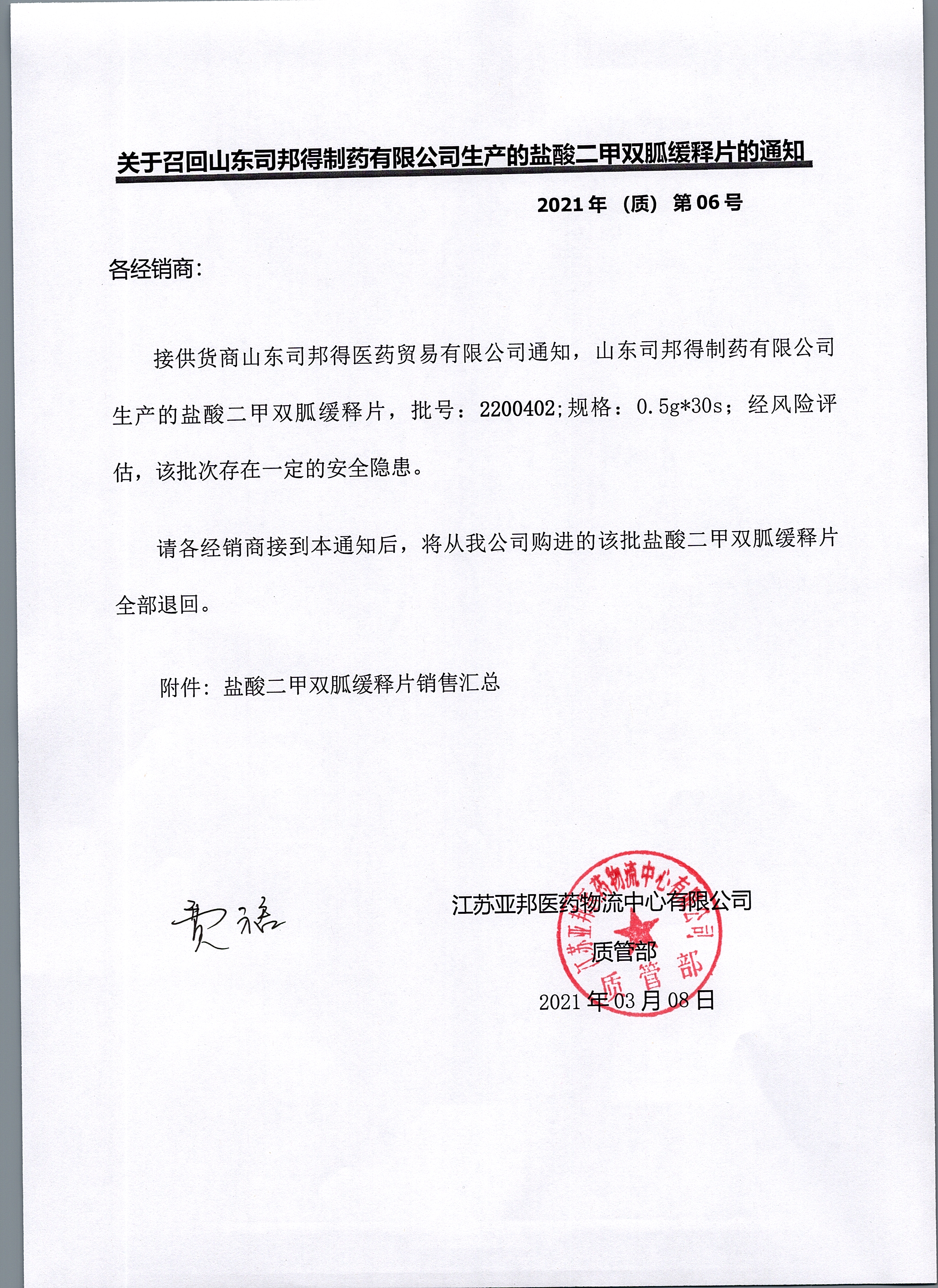 关于召回山东司邦得制药有限公司生产的盐酸二甲双胍缓释片的通知