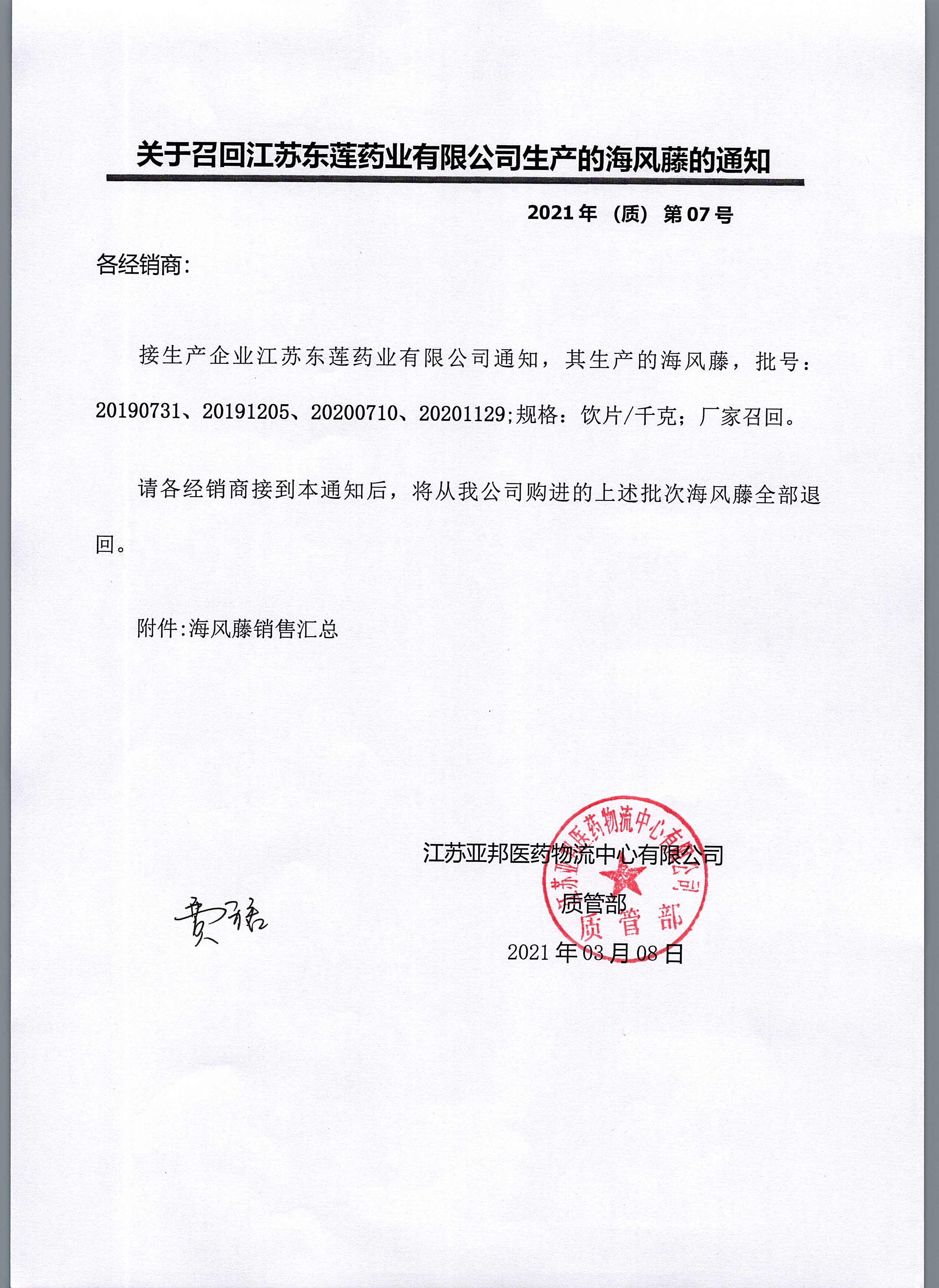 关于召回江苏东莲药业有限公司生产的海风藤的通知