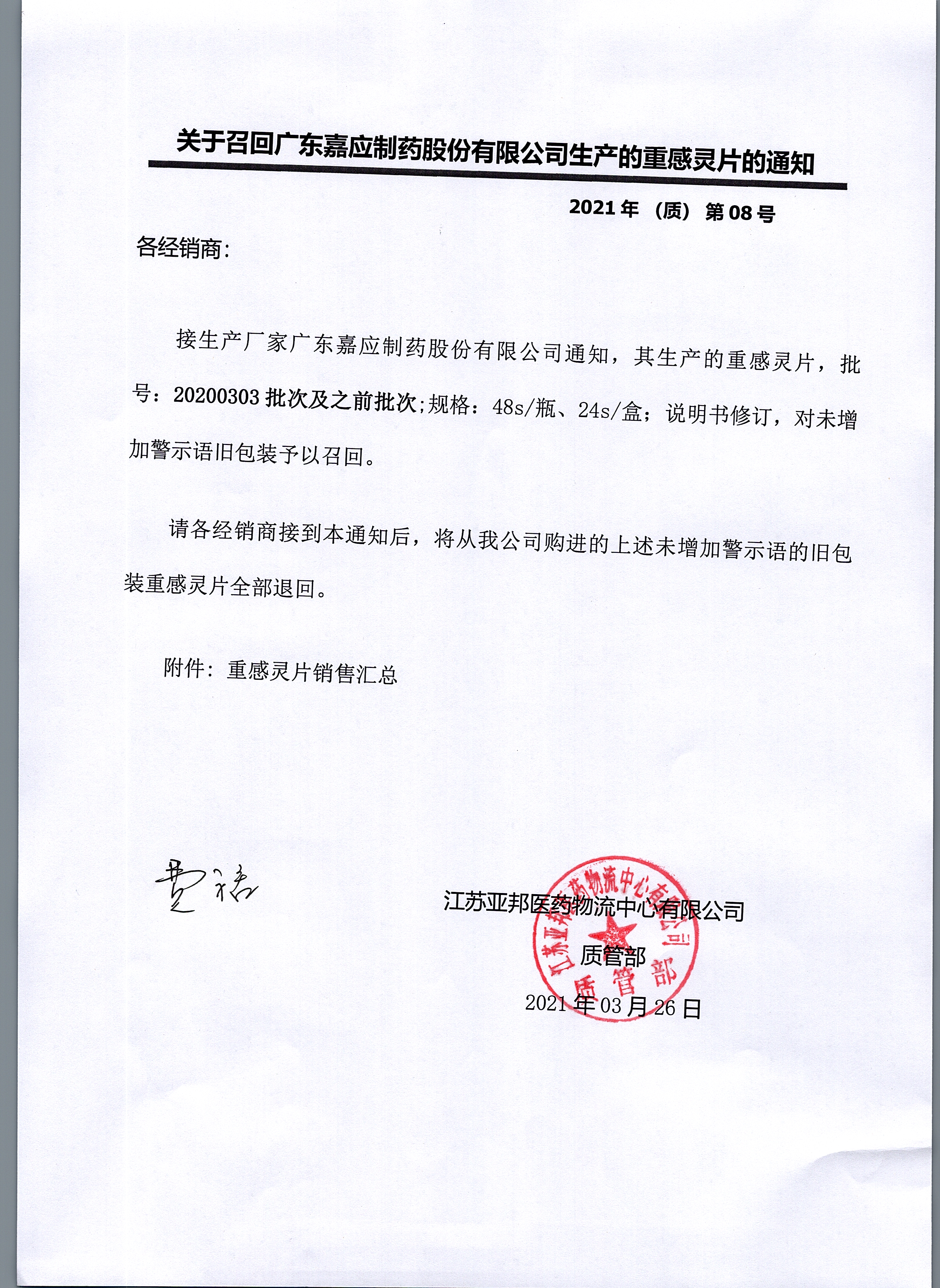 关于召回广东嘉应制药股份有限公司生产的重感灵片的通知