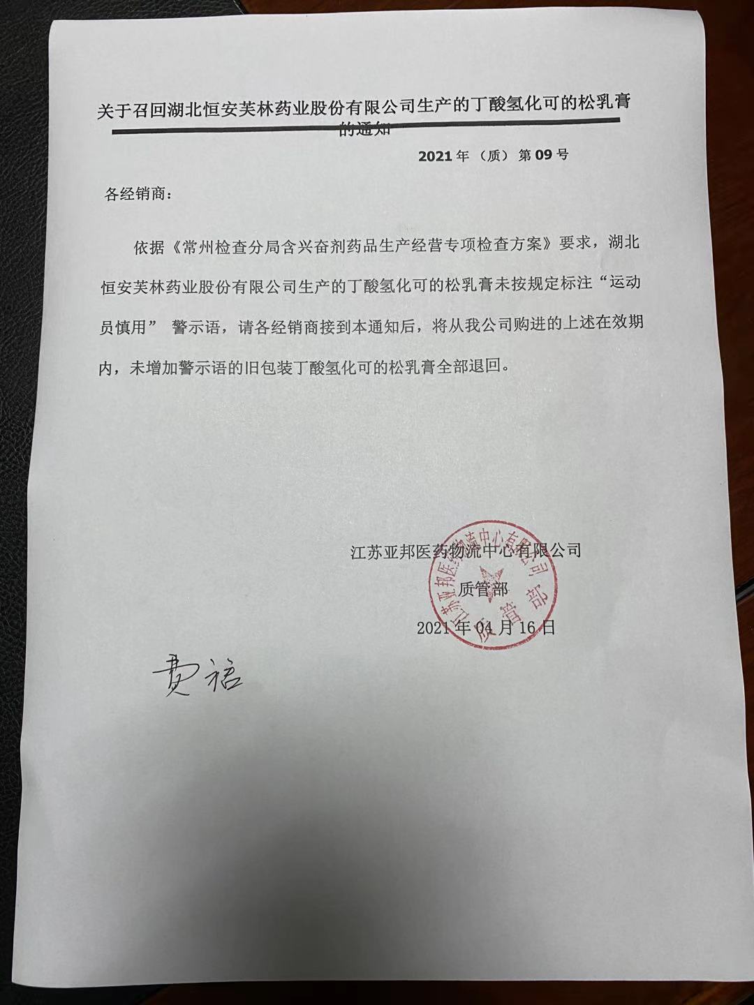 关于召回湖北恒安芙林药业股份有限公司生产的丁酸氢化可的松乳膏的通知